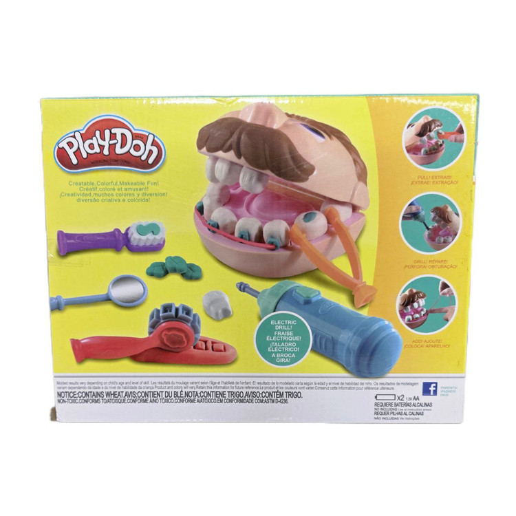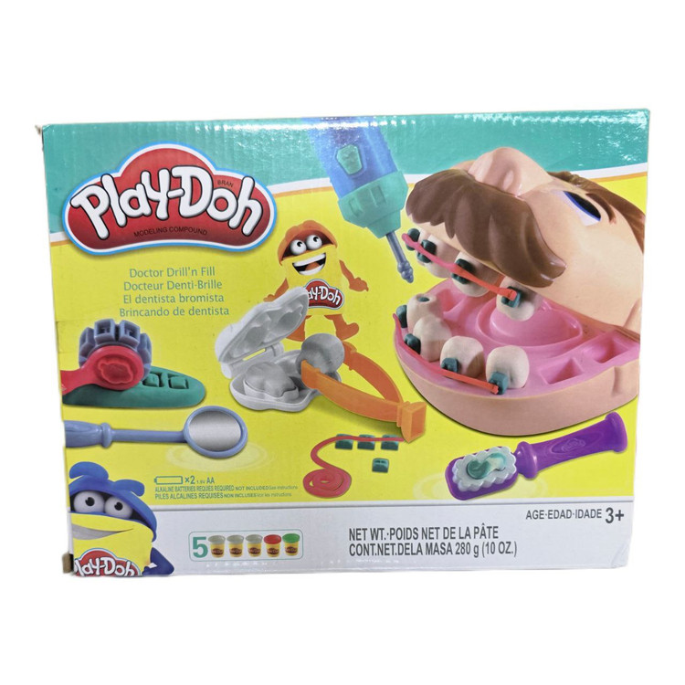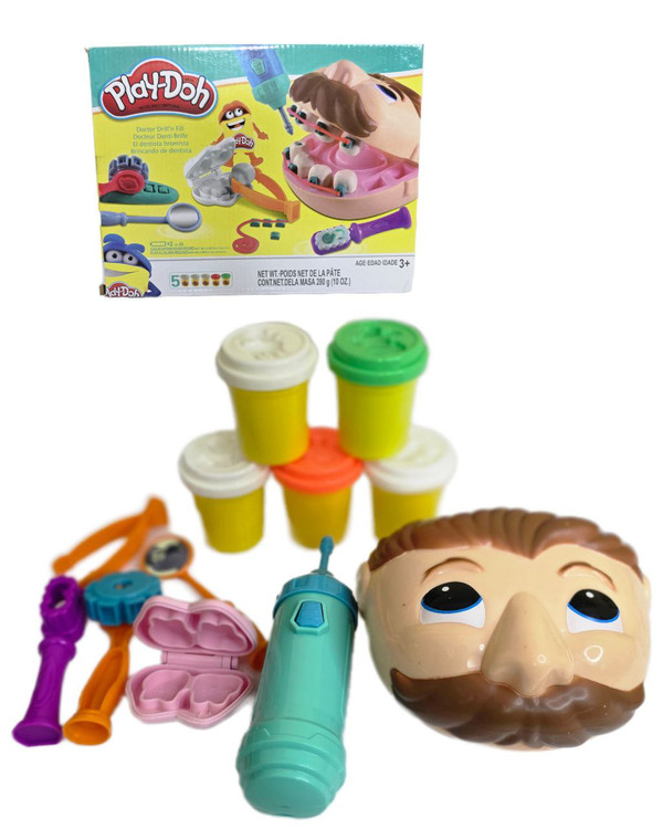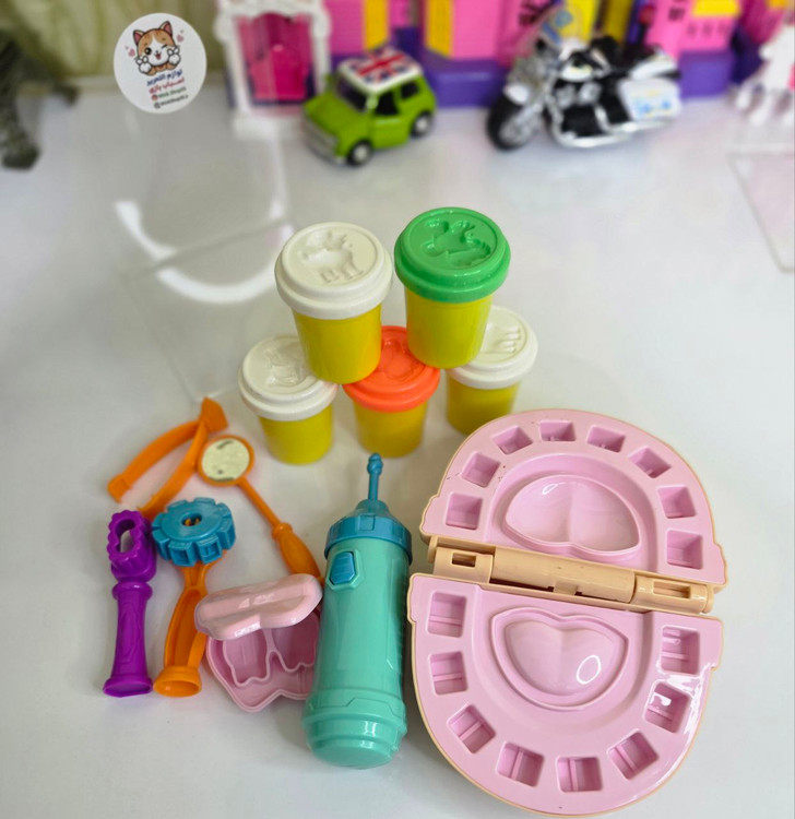 این ست خمیر بازی دندانپزشکی شامل 5 سطل کوچک خمیر،قالب،آینه دندان پزشکی،دریل دندان پزشکی،مسواک و ... می باشد