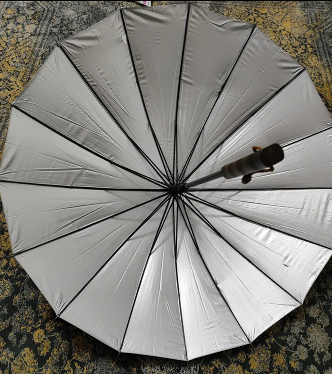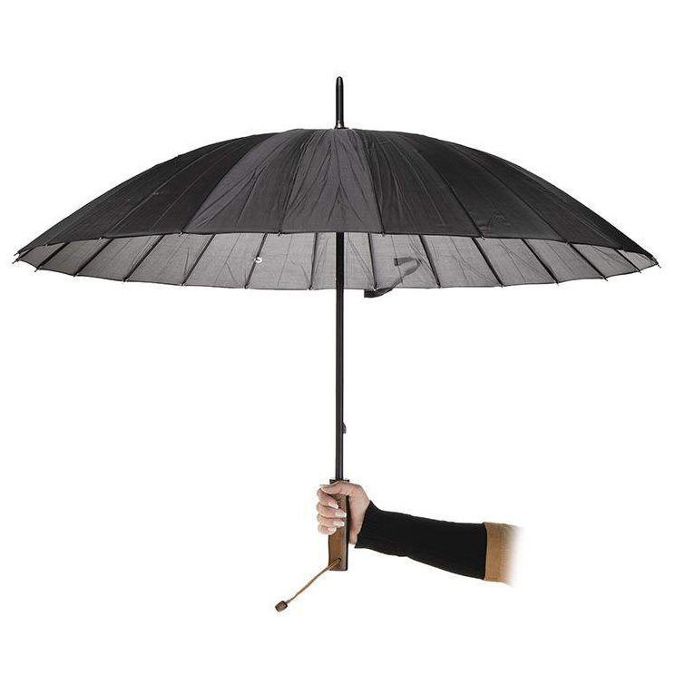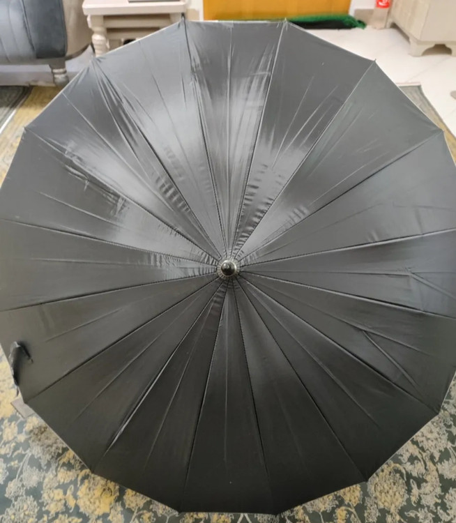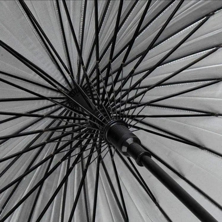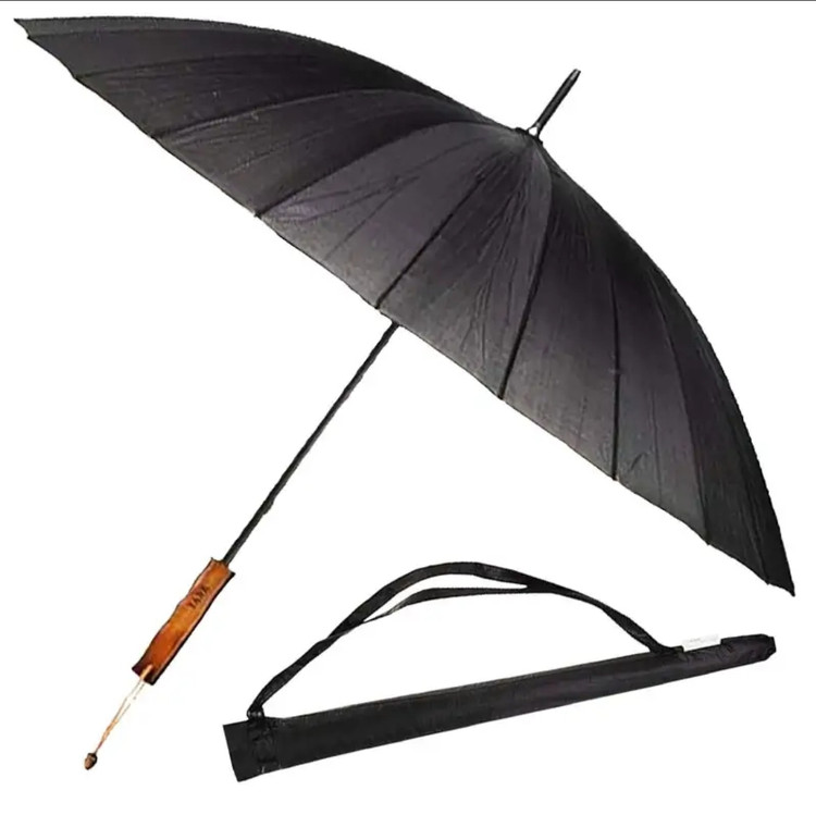24 فنر فلزی , مقاوت در برابر تند باد و استحکام بالای فریم فلزی , رنگ روی چتر مشکی و داخل نقره ای , دسته چوبی , کاور پوششی چتر همراه با بند قابل تنظیم شانی , بند دستی دسته چتر