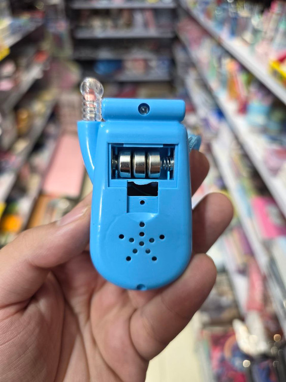 در پشت اسباب بازی جای سه باتری گرد (مدل باتری ساعت) است که باتری ها بر روی محصول قرار دارد. با برداشتن نوار قطع اتصال باتری های می توانید از این موبایل اسباب بازی استفاده کنید.
