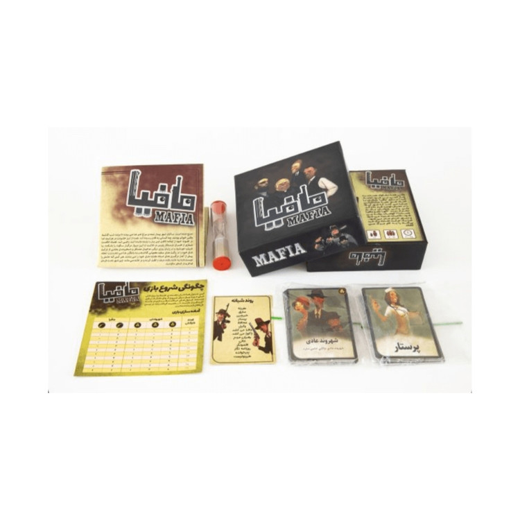 اقلام داخل بسته: کارت های شخصیت،کارت های گرداننده،دفترچه راهنما بازی،کارت روند شب و ساعت شنی