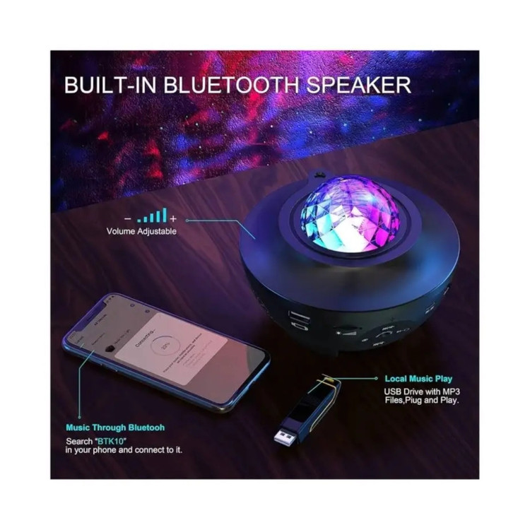 این چراغ خواب به یه بلندگوی بلوتوث داخلی مجهزه که به شما امکان میده موسیقی رو مستقیماً از طریق تلفن همراهتون پخش کنید. با استفاده از کنترل از راه دور، میتونید به راحتی حالت نور، روشنایی، سرعت حرکت نور و حتی تایمر رو تنظیم کنید.