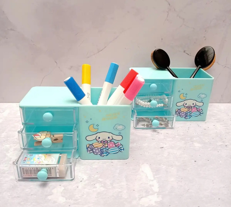 جاقلمی برای نگهداری قلم، مداد یا خودکار استفاده می شود. این نوع جاقلمی دارای بدنه ای ساخته شده ازپلاستیک فشرده می باشد و همچنین کشوهای این جاقلمی باعث کاربردی تر شدن جاقلمی برای جاگذاری پاکن و اقلام کوچک تعبیه شده است روی آن جلوه ای ویژه به این محصول بخشیده است. همچنین به عنوان زینت بخش میز دانش آموزان و دانشجویان نیز مورد استفاده قرار میگیرد.دوام بالا و همچنین طرح های ترند و کیوت و جذاب بودن و تنوع بالای طرح ها و رنگ ها باعث خاص بودن این جاقلمی گردیده است.