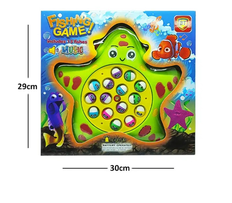 ابتدا در صفحه بازی باتری می گذارید و وقتی دکمه روشن را می زنید صفحه شروع به چرخیدن میکند و ماهیها هم بالا و پایین می شوند و دهانشون باز و بسته میشود. موقعه که دهانشان باز میشود چوب ماهیگیری را وارد دهان ماهیها کرده و آنها را شکار میکنیم.