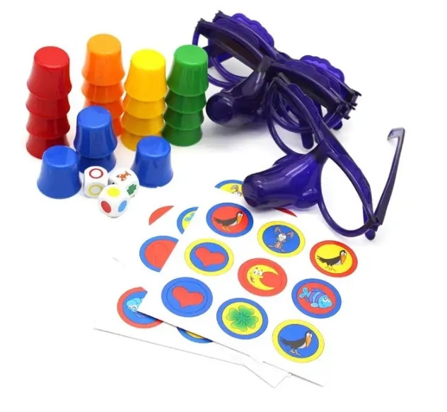 برای شروع بازی شش کارت تصاویر را وسط زمین بازی بچینید؛ هر بازیکن یک عینک به چشم میزند و ۵ لیوان با رنگهای مختلف را روی دماغک آن میگذارد. کوچکترین فرد تاس میاندازد. یکی از تاسها شکل مورد نظر و دو تاس دیگر رنگ دایرهی زمینه و حلقهی دور تصویر را نشان میدهد. هر بازیکنی که سریعتر بتواند تصویر مطابق با تاسها را از بین دیگر تصاویر پیدا کند، آن را نشان میدهد. اگر درست گفته باشد یکی از لیوانهای روی عینکش را برمیدارد؛ اما اگر اشتباه کرده باشد باید یک لیوان به عینکش اضافه کند.