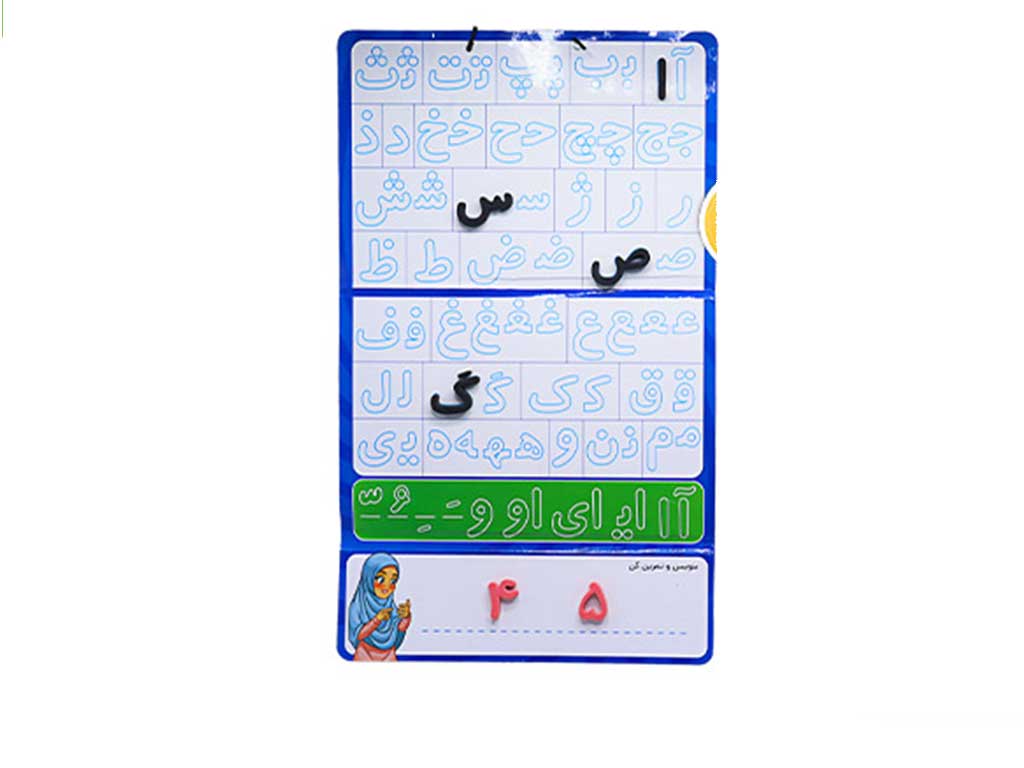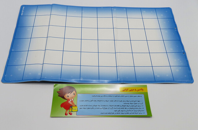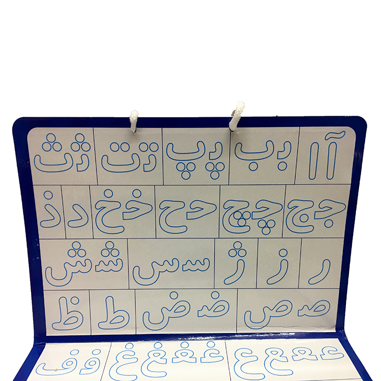 صفحه وایت بردی به صورت دورو می باشد و شما می توانید از هر دو روی آن به دو شیوه متفاوت برای آموزش الفبا و کلمات فارسی به کودک دلبندتان استفاده کنید. یک رو برای آموزش حروف فارسی و تمرین آن است و روی دیگر صفحه بازی با حروف.