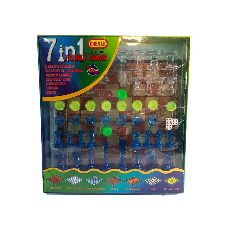 شطرنج کریستالی و 7 بازی دیگر شامل مهره های شطرنج به همراه صفحه بازی است . این مجموعه شامل هفت بازی شطرنج، تخته نرد، منچ ، دوز، مار و پله و … است .