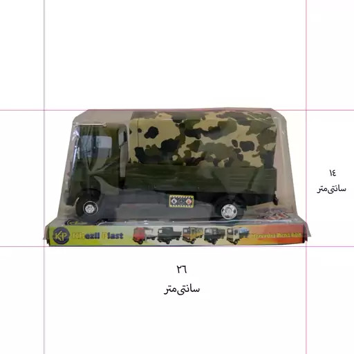ماشین ساده مدل کامیون ارتشی یک ماشین بازی با سایز متوسط است که 22 سانتیمتر طول دارد. اگر در بین اسباببازی فرزند دلبندتان انواع سرباز یا کوماندو وجود دارد خرید این اسباب بازی یک انتخاب کاملا درست و به جا است. محفظه خالی این کامیون میتواند جایی برای جا به جا کردن سربازان یا دیگر اسباب بازیهای کوچک جنگی کودکان باشد.