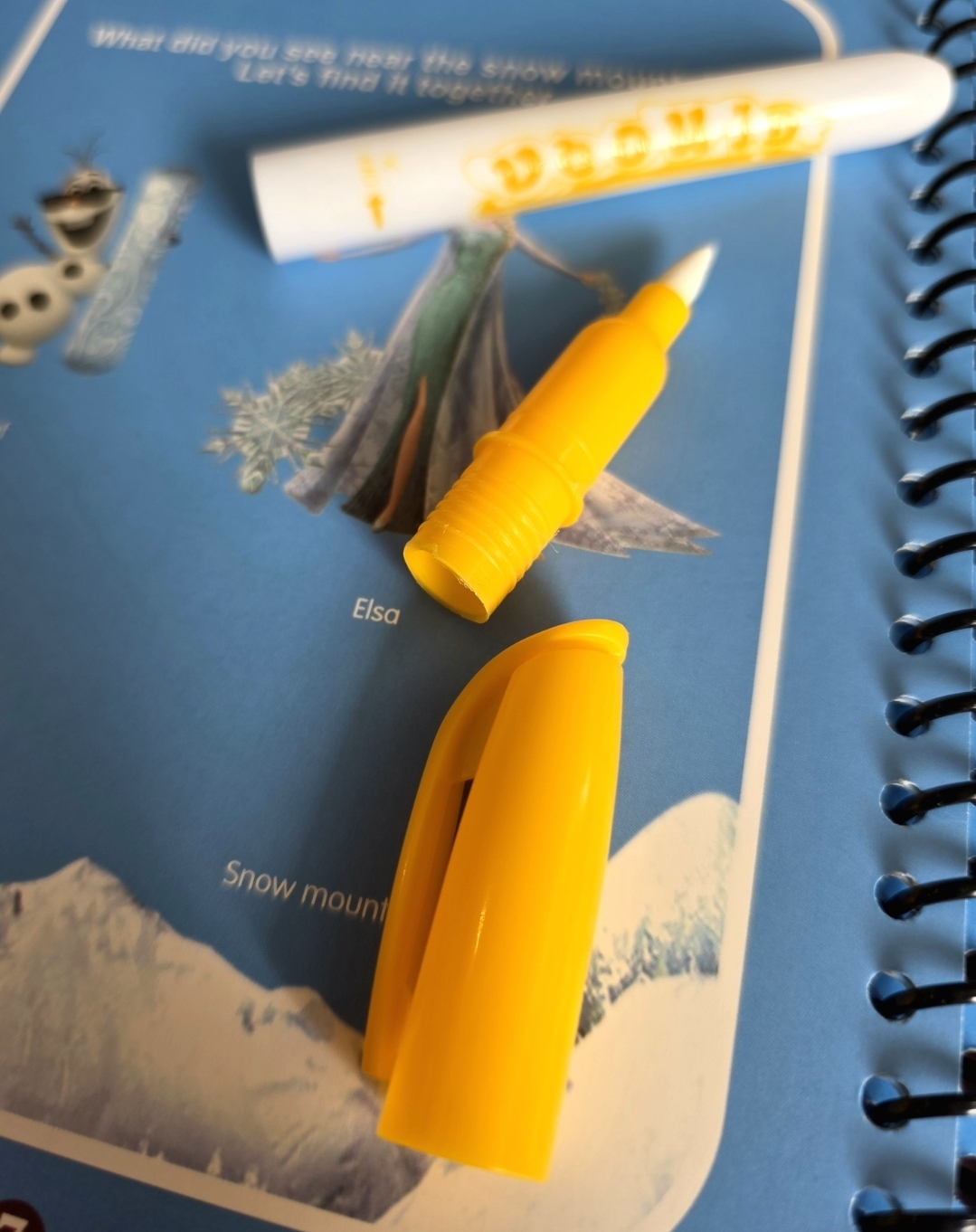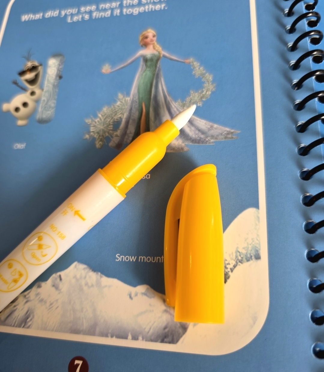 کافیه قلمش رو پر از آب کنید و دست کودک بدین و با تماس نوک قلم با صفحات سفید دفتر،تصاویر رنگی نمایان میشن. و بعد از چندلحظه دوباره به حالت سفید قبلی برمیگردن😊😊