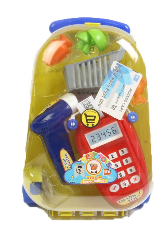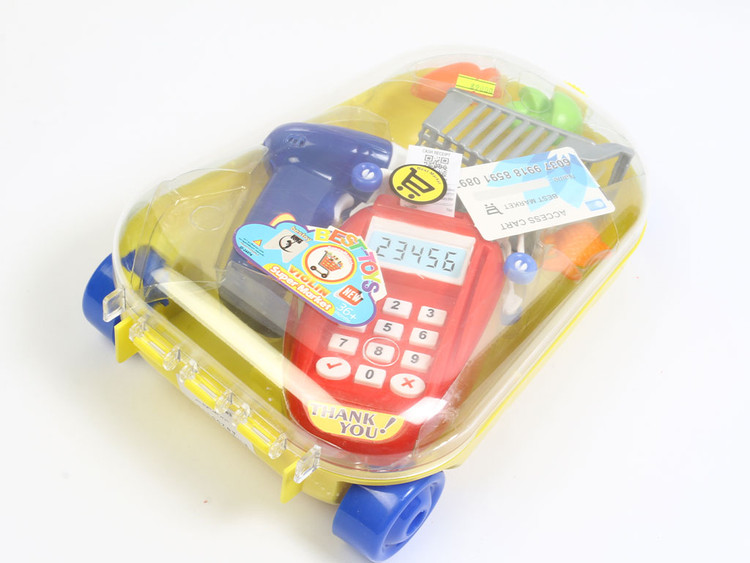 ست صندوق فروشگاهی دارای بارکدخوان و سبد خرید است که کودکان می توانند خرید های خود را در آن جا قرار دهند.