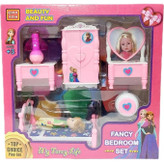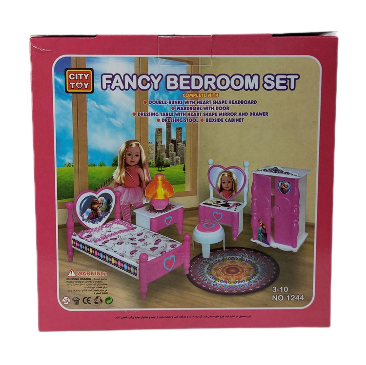 اسباب بازی اتاق خواب مدل fancy bedroom set تمامی وسایل مورد نیاز یک اتاق خواب را دارد تا کودک دلبند شما بتواند به طور کامل در تصوراتش با آنها بازی کند، این ست شامل عروسک ، تخت خواب ، میز آرایش ، صندلی ، کمد لباس ، میز کنار تخت و آباژور میباشد